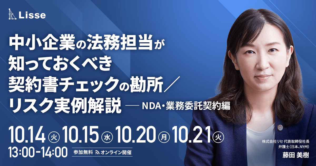 【10月開催セミナー】中小企業の法務担当が知っておくべき 契約書チェックの勘所/ リスク実例解説(NDA・業務委託契約編)