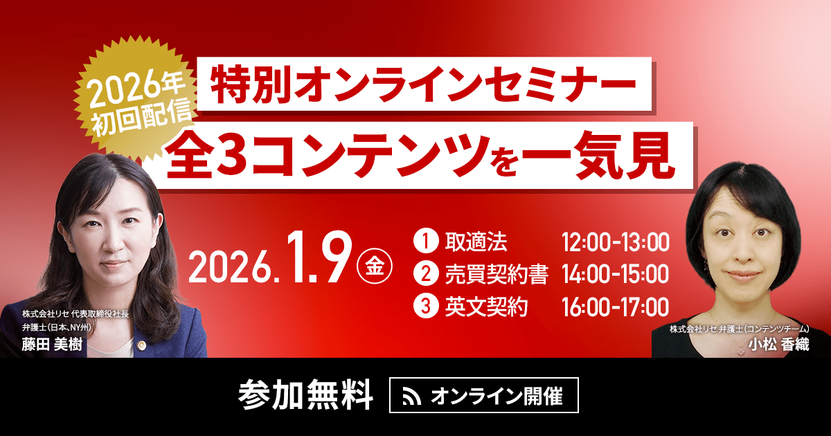 2026年の法務業務のスタートダッシュを応援するため、過去に人気の高かった3つの重要テーマを連続配信いたします。取適法(改正下請法)、売買契約、英文契約、と、実務に直結する講座を凝縮してお届けします。企業間紛争の専門弁護士および裁判官出身の法務エキスパートが徹底解説いたします。