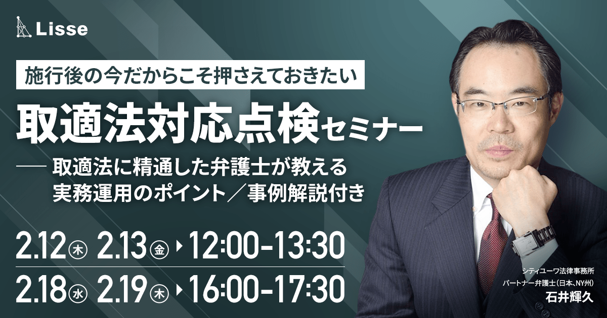 2026年1月施行の取適法について、施行直後だからこそ押さえるべき実務運用のポイントを専門弁護士が解説します。基礎のおさらいから、取引ステージ別の留意点、セーフラインの見極め、事例ベースの従業員教育のポイントまで、法務担当者が自信を持って社内対応できる知見を90分でお届けします。シティユーワ法律事務所の石井輝久弁護士が講師を務めます。是非奮ってご参加ください。
