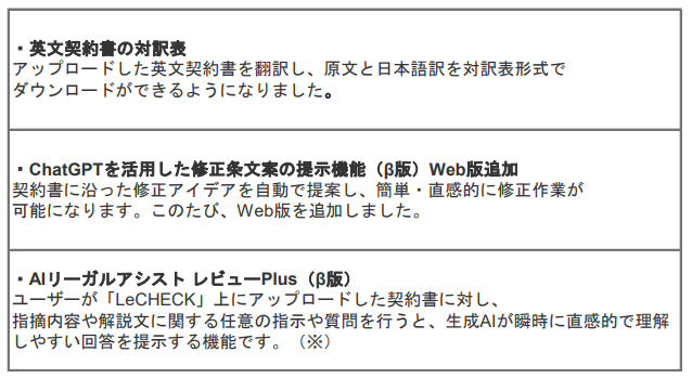 (※)プレスリリース:『「LeCHECK」、生成AIで契約リスクを瞬時に要点把握できる新機能「AIリーガルアシスト レビューPlus」(β版)の提供を開始』