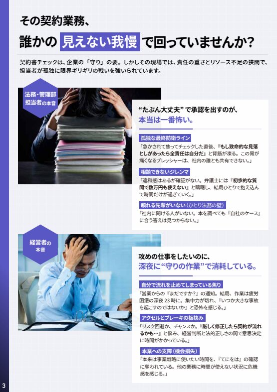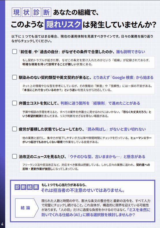 契約書チェックの現場で担当者が抱える「見落としへの不安」や「承認時のプレッシャー」に焦点を当てた診断資料です。「Google検索頼みになっている」「疲労時に読み飛ばしの懸念がある」など、組織に潜む5つのリスクをチェックリスト形式で可視化。心理的な負担を軽減し、自信を持って承認するための「AIダブルチェック」という新しい運用スタイルをご提案します。