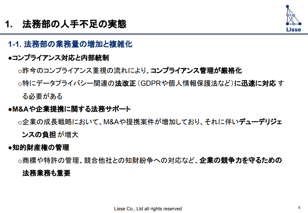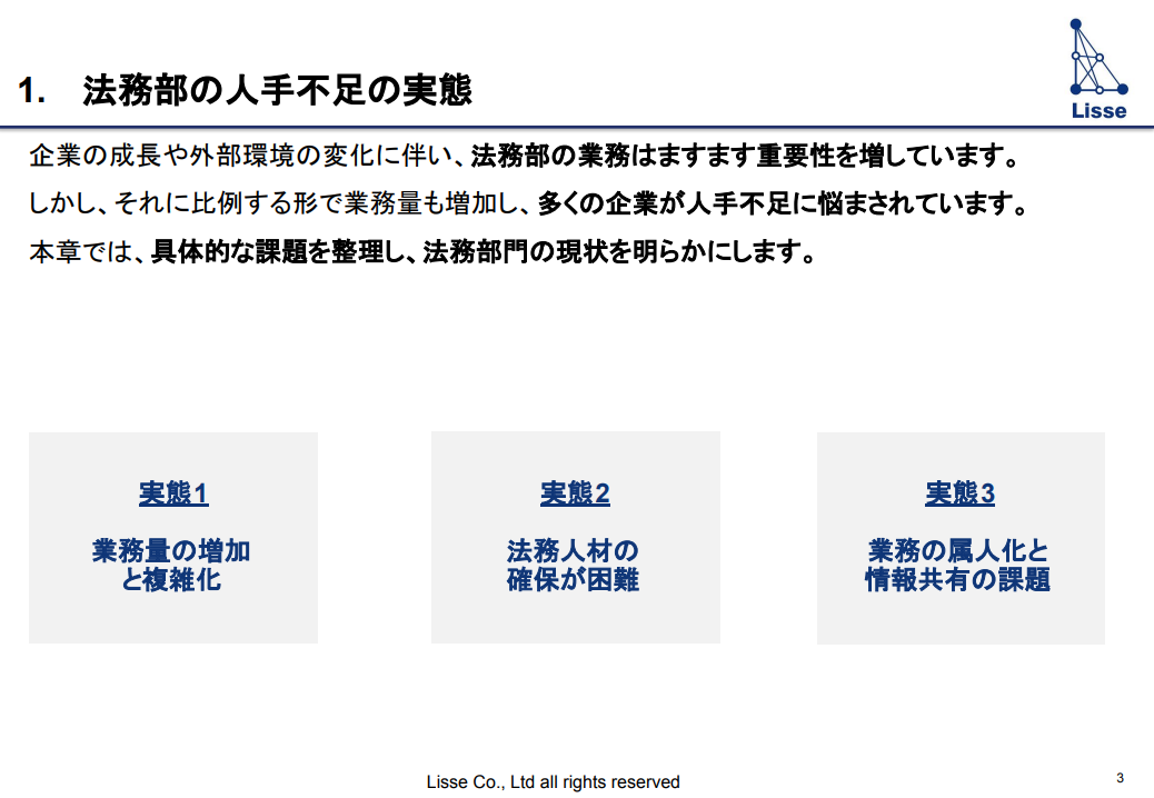 かんたん1分入力 必要事項をご記入の上、お進みください。 フォーム送信完了後、 折返し資料をお送り致します。 法務業務の人手不足を解消するには? AI活用を含む実践的解決策 資料ダウンロード この資料で分かること 法務部の人手不足の実態 人手不足の解決策 AIツールによる解決方法 必要事項をご記入の上、お進みください。 フォーム送信完了後、折返し資料をお送り致します。