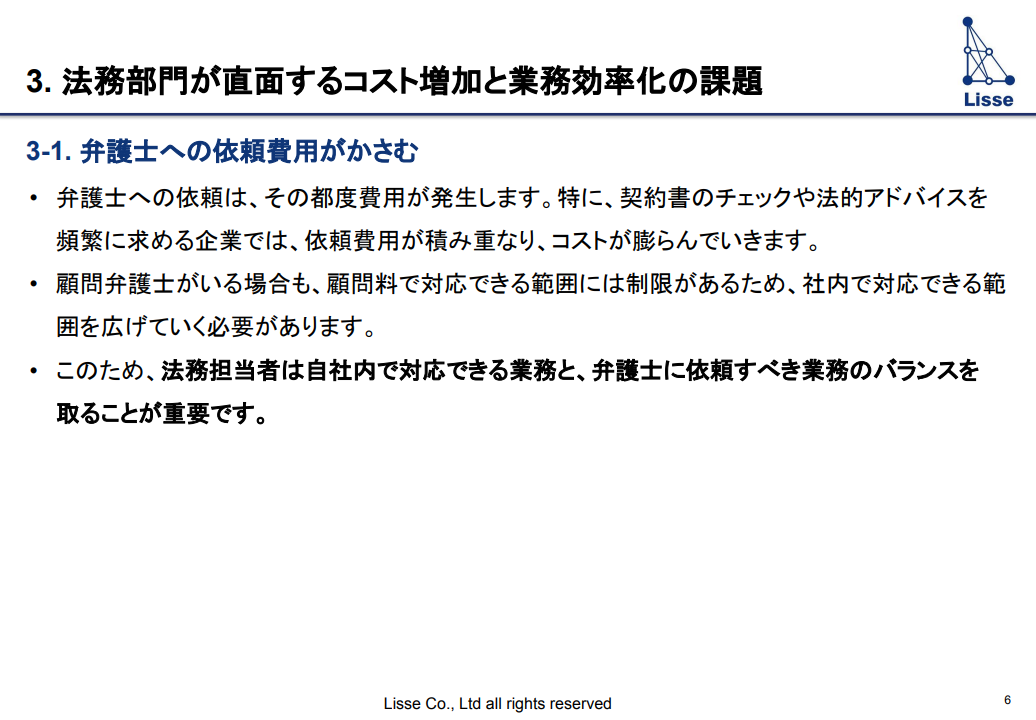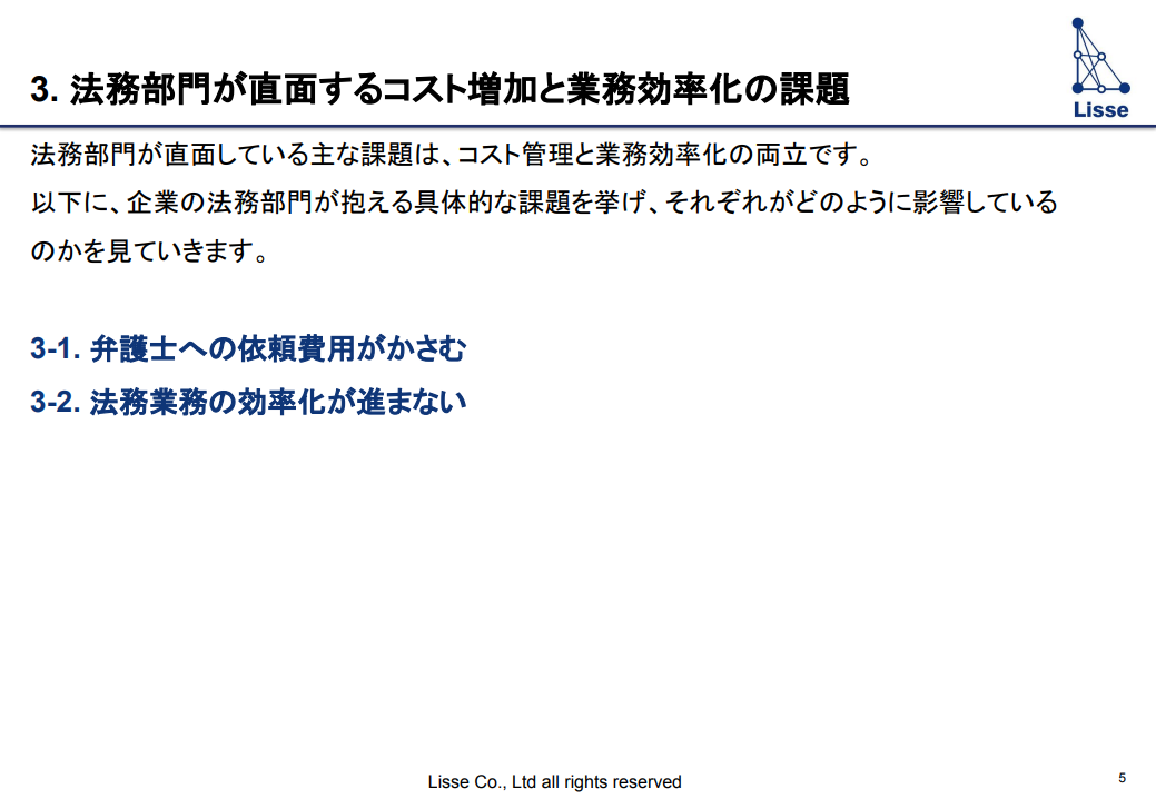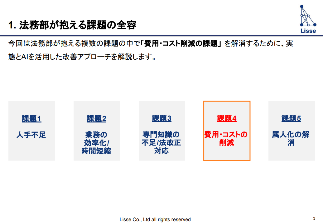 かんたん1分入力 必要事項をご記入の上、お進みください。 フォーム送信完了後、 折返し資料をお送り致します。 AIで変わる法務業務 コスト最適化と生産性向上を実現する新しい選択肢とは? 資料ダウンロード この資料で分かること 法務部門が直面するコスト増加と業務効率化の課題 コスト削減に向けたアプローチ AIが実現する法務部門のコスト削減と業務効率化 必要事項をご記入の上、お進みください。 フォーム送信完了後、折返し資料をお送り致します。