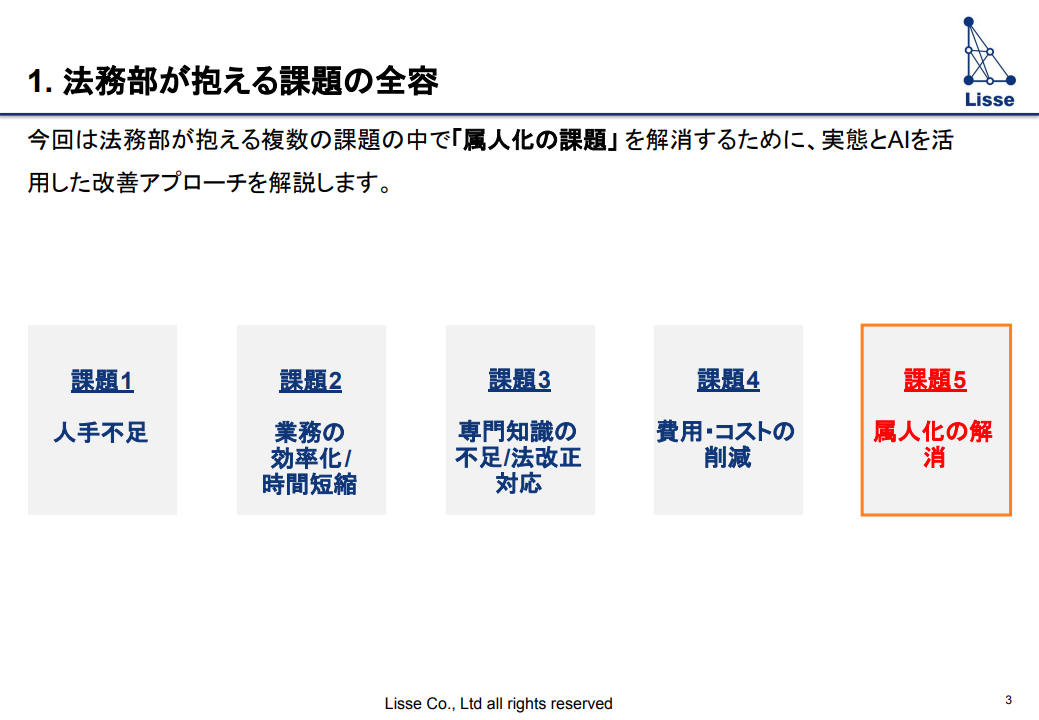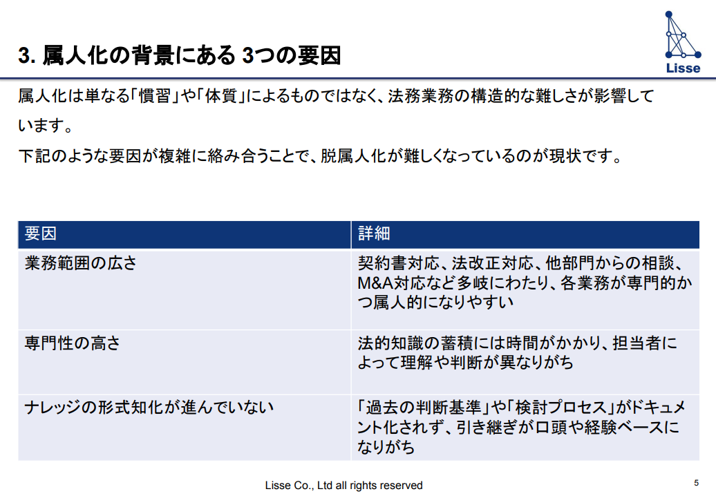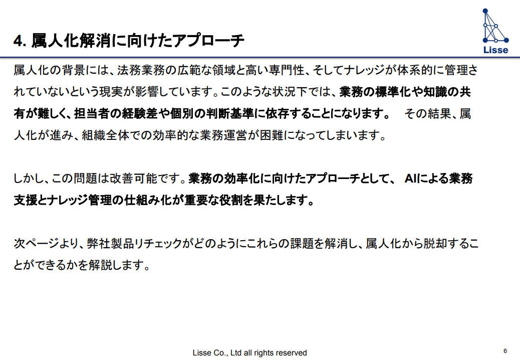 かんたん1分入力 必要事項をご記入の上、お進みください。 フォーム送信完了後、 折返し資料をお送り致します。 法務部の属人化脱却方法とは? AIツールで実現する 安定した体制構築の実践アプローチ 資料ダウンロード この資料で分かること 属人化の背景にある3つの要因 属人化解消に向けたアプローチ AIとナレッジ活用で属人化の根本から改善 必要事項をご記入の上、お進みください。 フォーム送信完了後、折返し資料をお送り致します。